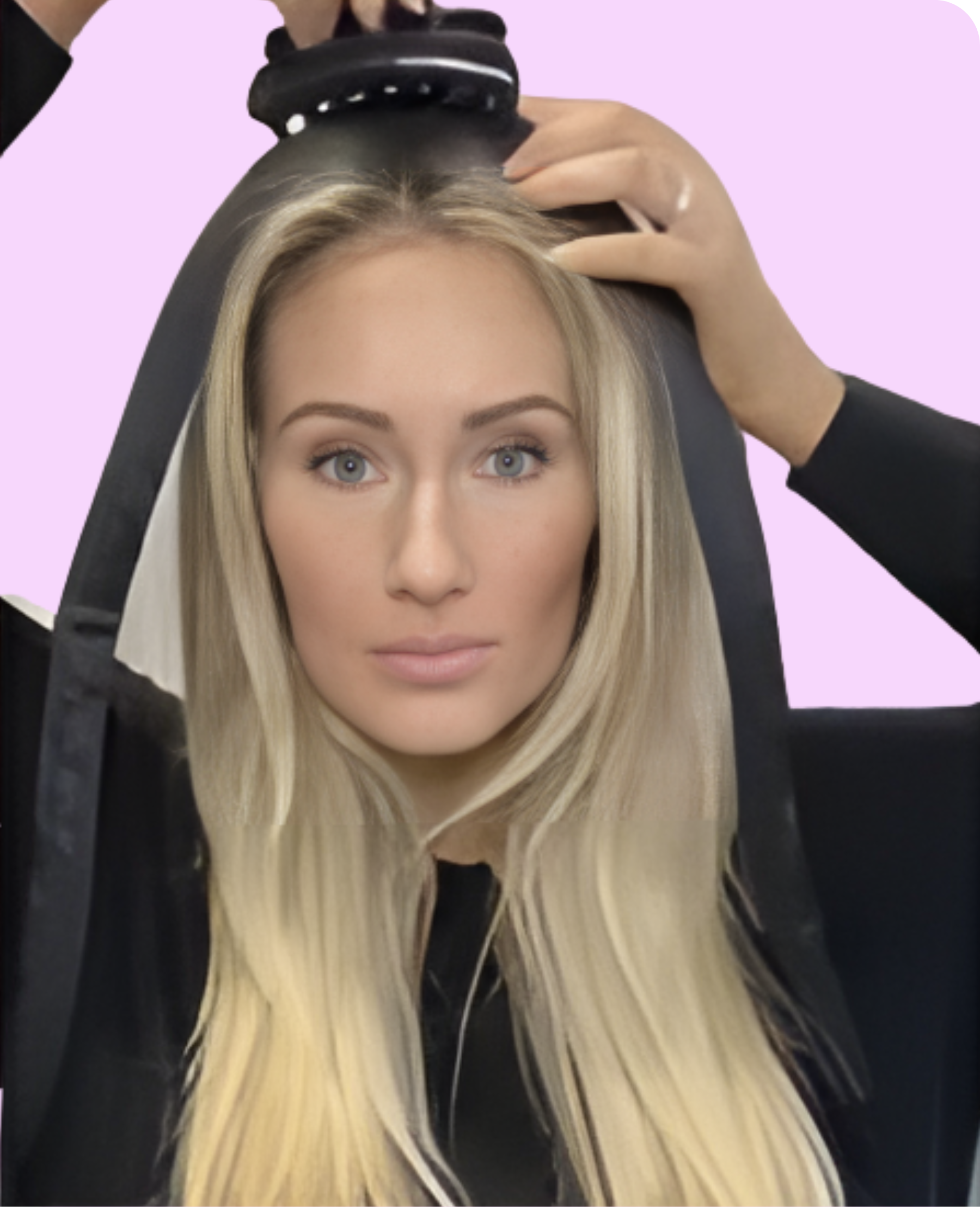 Con el cabello ligeramente húmedo (o apenas humedecido con un spray), coloca la diadema en el centro de la cabeza y fíjala en la parte superior. Asegúrate de que quede cómoda y bien posicionada antes de empezar a rizar.
